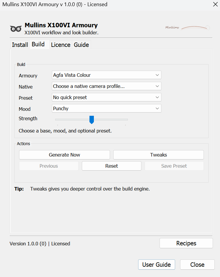 Armoury profiles are the bundled Mullins look profiles. Native profiles use Fujifilm-style camera profile helpers as the starting point. Choose one route as the base for the generated look.